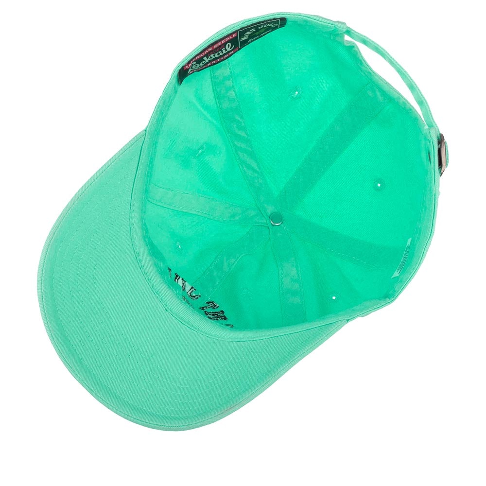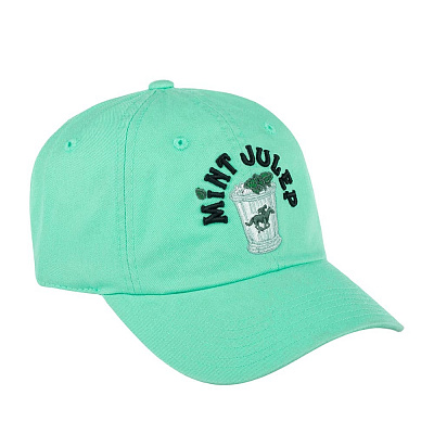 Американская бейсболка Mint Julep из серии Archive Coctail. Бейсболка сшита из чистого хлопка мятного оттенка. Модель с широким чуть изогнутым прошитым козырьком. На передней мягкой панели вышиты название коктейля Mint Julep, листья мяты и наездник, которого дизайнеры поместили внутрь стакана. Джулеп – официальный напиток Кентуккийского дерби (конных скачек). Его делают на основе бурбона (или другого крепкого спиртного напитка), воды, дробленого льда и свежей мяты. Размер бейсболки регулируется с помощью текстильного ремешка с металлической пряжкой и кнопки. Длина козырька – 7 см, глубина – 11 см. Для комфортной посадки внутри предусмотрена хлопковая лента, на ней – фирменная нашивка с названием архивной коллекции и датой 1850 – предполагаемый год, когда напиток джулеп впервые был изготовлен в одном из американских баров. К бейсболке прилагается вкладыш с аутентичной рецептурой коктейля.