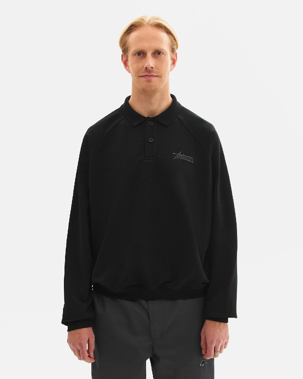 Свитшот Anteater в стиле рубашек поло, с воротником на пуговицах. Украшен минималистичной вышивкой на груди, рукава реглан, актуальная длина кроп. Такое изделие отлично подойдет для учебы, офисной работы или похода в ресторан или бильярдную. Выглядит аккуратно и легко впишется в гардероб. В основе трехниточный футер, без начеса.