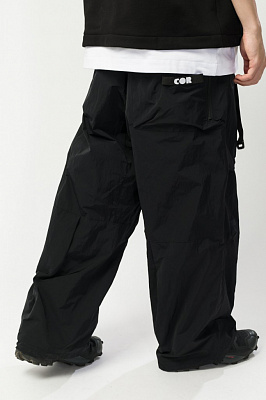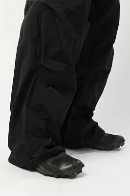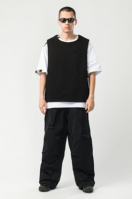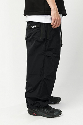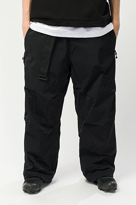 Утеплённые штаны оверсайз прямого кроя. Силуэт и форма посадки отсылают к культовому сноубордическому техвиру начала 2000-х.Регулировка объёма пояса при помощи стропы и пряжки;