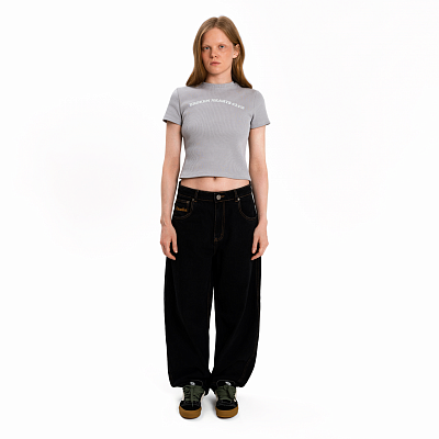 Укороченная женская футболка из плотного фактурного хлопка. Нанесение выполнено шелкографией