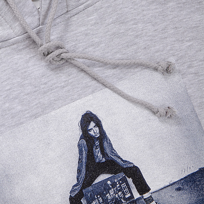 Толстовка с начёсом классического меланжевого цвета. Материал мягкий и тактильно приятный на ощупь. Толстовка широкого кроя со смещённым плечевым швом. Плоские металлические люверсы под шнурки и двойная обработка капюшона с подкладкой. На груди фото-принт Сони с холстом, а на спине большое лого коллекции.