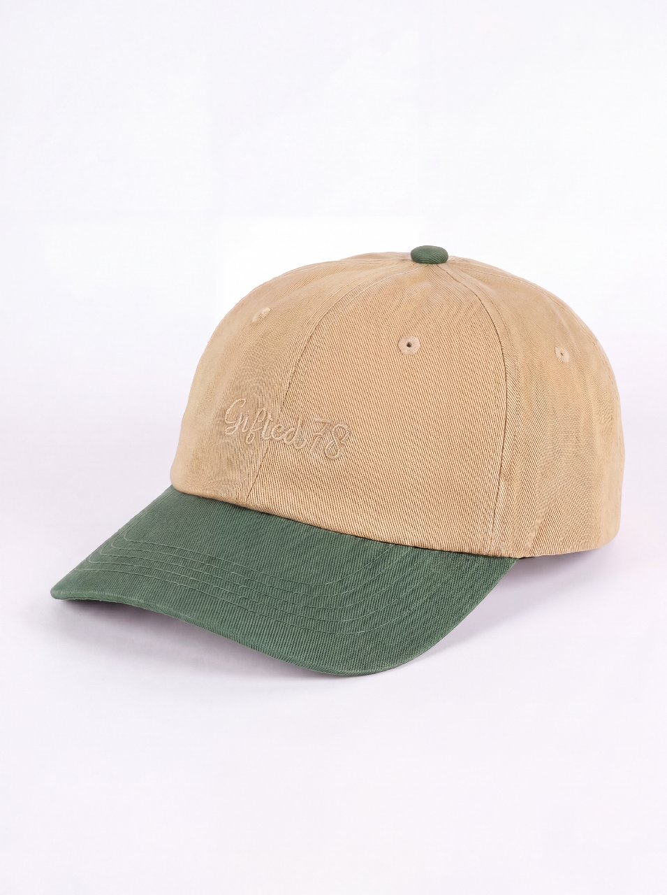 Стильная бейсболка в двухцветном дизайне: верхняя часть выполнена в светло-бежевом оттенке, козырёк — в насыщенном зелёном цвете. На передней панели кепки изящно вышито название бренда «Gifted78», что придаёт изделию лаконичность и выразительность.
