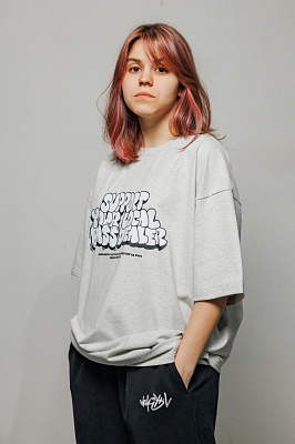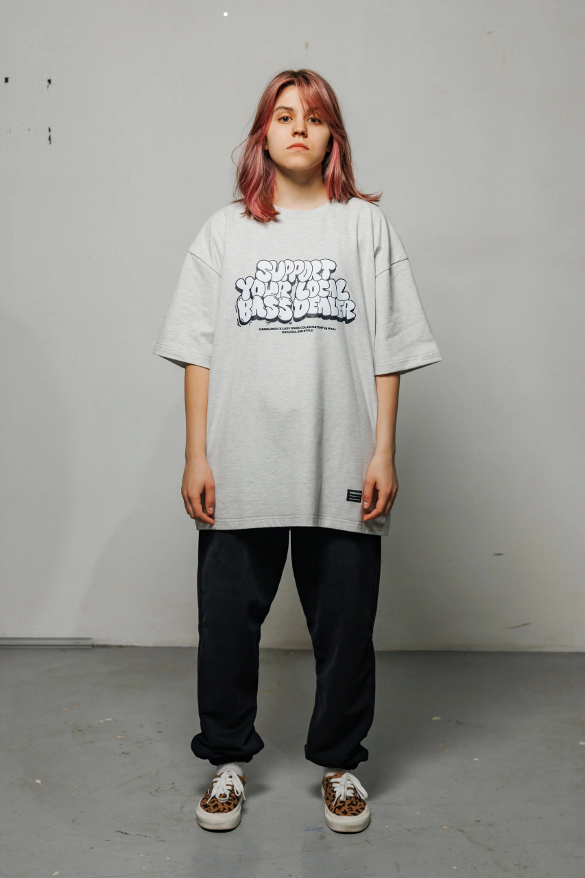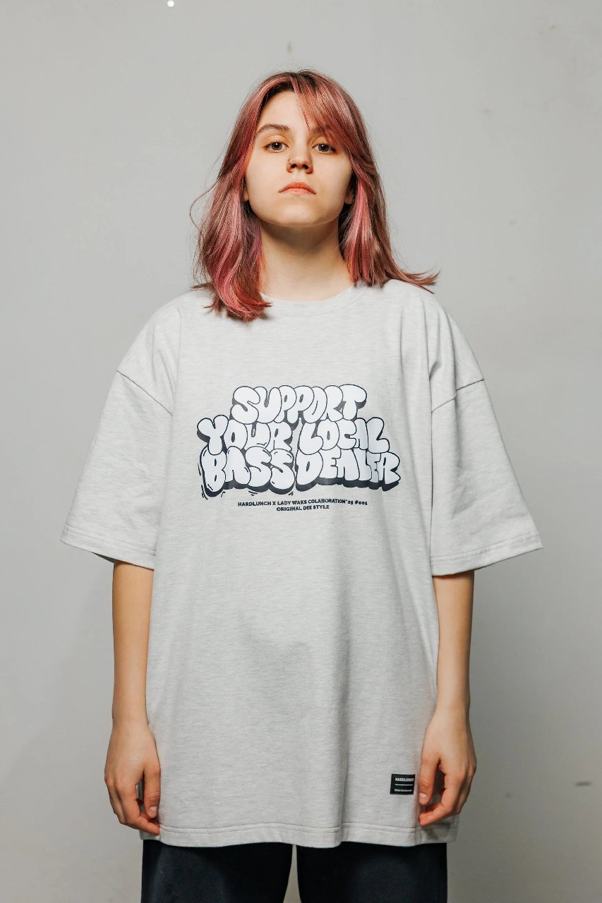Футболка HARD LUNCH x Lady Waks оверсайз Repeat серый меланжПервый из принтов коллаборации Hard Lunch x Lady Waks - "Support Your Local Bass Dealer"