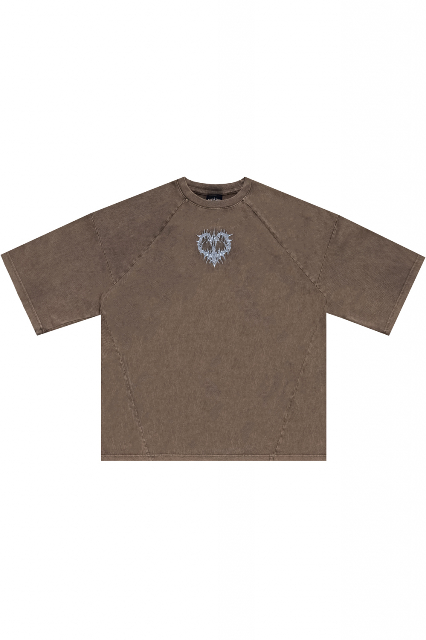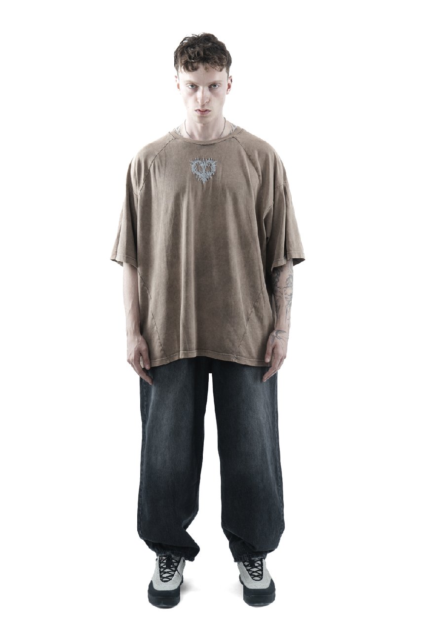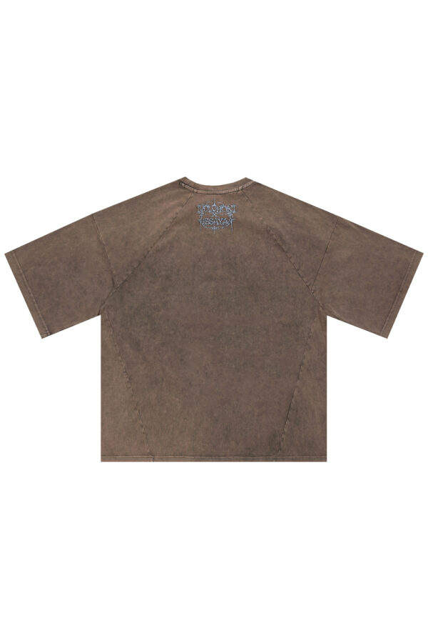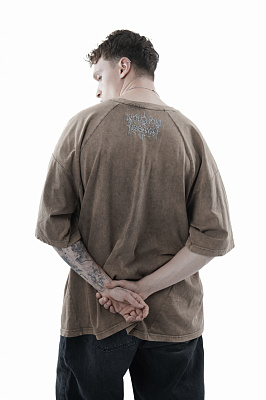 Оверсайз футболка сложного кроя окрашенная по технологии garment dye с дополнительной acid wash обработкой. Нанесение на груди и на спине в виде вышивки. Футболка выполнена из кулирной глади качества пенье плотностью 250гр.