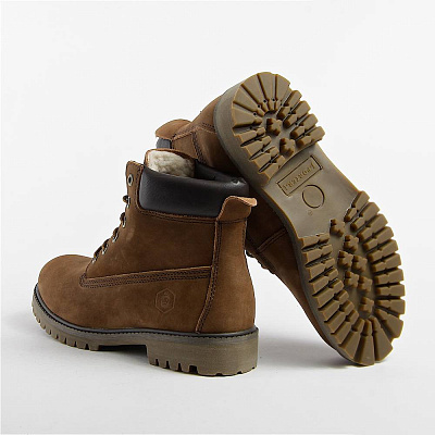 Ботинки выполнены из прочного нубука с отделкой из кожи. Внутренняя часть изготовлена из шерсти. Установлены на износостойкую и нескользящую резиновую подошву с протектором. Полностью прошитый верх ботинка гарантирует качество и надежность модели.