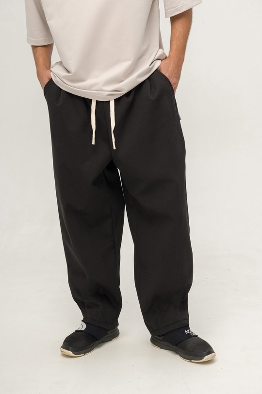Брюки свободного кроя из плотного хлопкового материала, утепленные флисом.– Пояс на эластичной резинке со шнурком