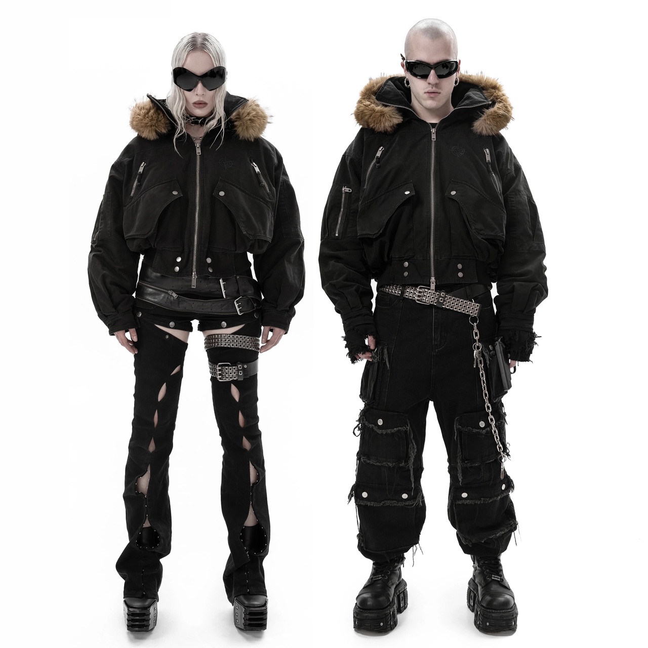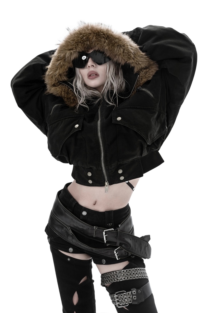 2. Крой и дизайн Укороченная объемная модель в брутальном стиле. Капюшон оснащён съёмным мехом, который крепится на пуговицы. Сам капюшон также является съемным и крепится на молнию к воротнику. Таким образом куртка является универсальной и имеет несколько вариантов стилизации.