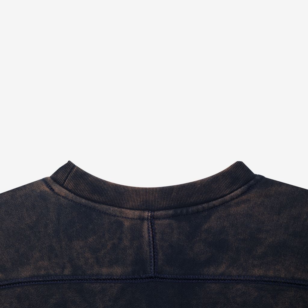 Свитшот универсального свободного кроя с акцентными швами, сшитый из плотного и износостойкого хлопкового футера с петельчатой изнанкой. Эта модель была предварительно постирана с энзимами для достижения винтажного вида и неповторимого "мраморного" узора материала. Каждый узор уникален — двух похожих свитшотов вы не найдете.