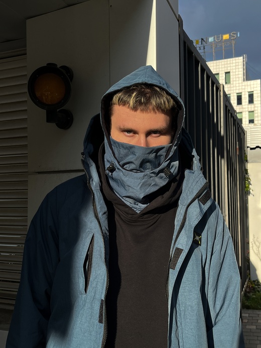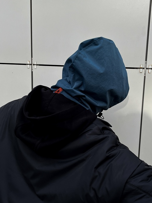 Капюшон выполнен из флисового подклада на внутренней части (190 гр) и внешней из мембранного материала с мятым эффектом.