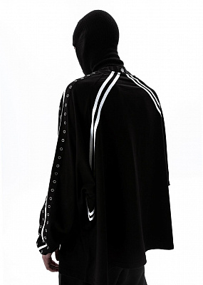 Изделие дополнено хлопковыми стропами-лентами по длине рукавов, а также передней и задней частей туловища. Рукава также дополнены стропами-лентами с металическими кольцами. Силиконовый брендированный патч на груди. В ворот сзади вставлена эластичная плотная резинка с силиконовым лого.