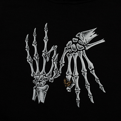 - На груди принт с распальцовкой из костей, в виде слова «щит».