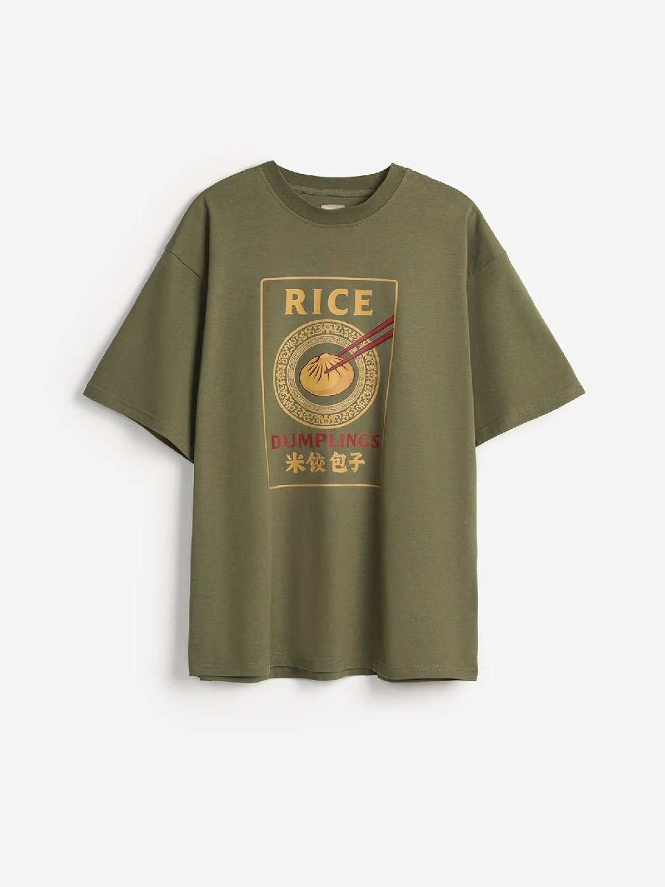 Принт RICE DUMPLINGS — тёплая отсылка к азиатской культуре еды, общения и уюта. Здесь бренд RICE превращает простое блюдо в символ ремесла и традиции. Тонкие золотые орнаменты, глубокий оливково-зелёный фон и акцентные красные иероглифы создают ощущение старинной вывески из шанхайской чайной 50-х. Это не просто еда — это вкус Азии в визуальной форме, часть общего культурного кода бренда RICE, где каждая деталь рассказывает о красоте повседневного, о тепле рук и о жизни, наполненной вкусом и смыслом.Печать выполнена методом шелкографии, которая надолго сохранит принт в первоначальном виде. Футболка свободного кроя с круглым воротом из плотного 100% хлопка высокого качества для комфортных образов на каждый день. 6300