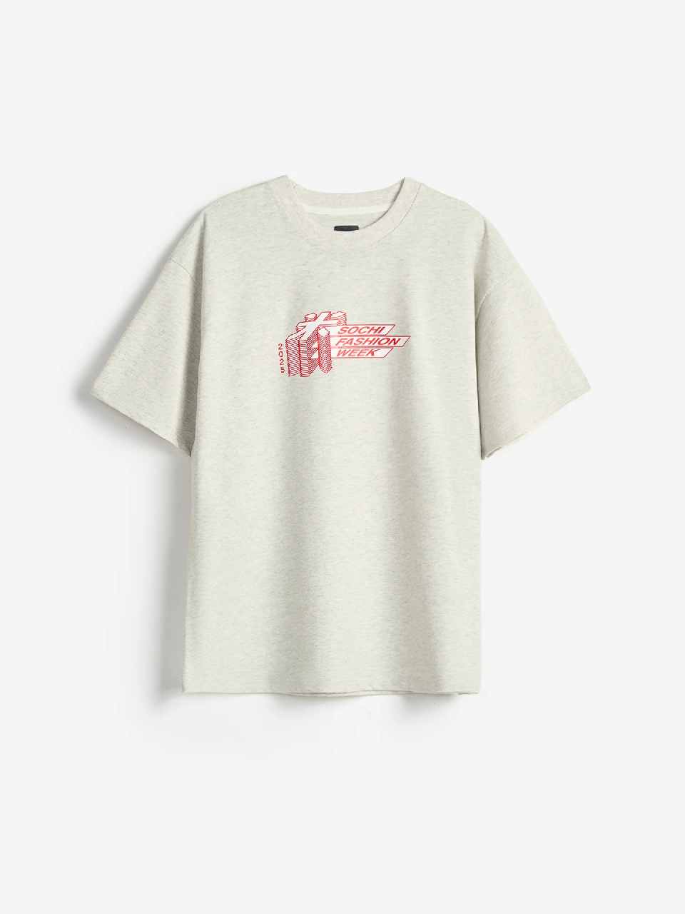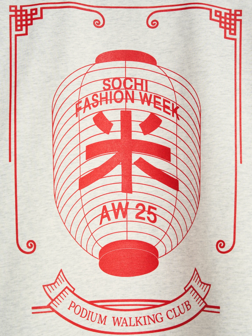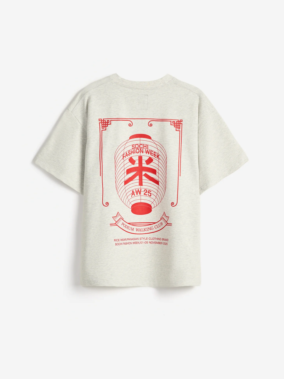 На передней части — минималистичный логотип SOCHI FASHION WEEK 2025, выполненный методом шелкографии в насыщенном красном цвете. На спинке — крупный графический элемент в виде японского фонаря с иероглифом 米 (“рис”), символом бренда RICE. В композиции скрыто сообщение “PODIUM WALKING CLUB” — метафора сообщества, которое движется вперёд, объединяя креативность, движение и стиль. Меланжевая текстура ткани добавляет мягкости и объёма, делая вещь универсальной — и для подиума, и для повседневности.