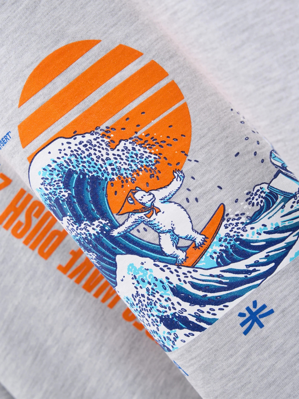 При создании принта мы решили объединить азиатсую эстетику нашего бренда и брендинг ребят из ТАО "Берег". Так появилась волна из риса, вдохновленная знаминитой картиной японского художника Кацусики Хокусая «Большая волна в Канагаве», и медведь в косынке - символ серфинга на ТАО "Берег".