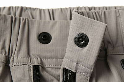Практичный дизайн включает 6 вместительных карманов: два накладных карго на кнопках SUNGRIP, два боковых и два задних. Пояс оснащен утягивающей резинкой и фиксирующим шнуром. Надежная японская кнопка SUNGRIP и качественная молния YKK обеспечивают долговечность использования. На поясе предусмотрено пластиковое полукольцо.