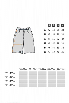 36 - талия полуобхват 47 см, длина по внешнему шву 59 см, ширина штанины в области бедра полуобхват 40 см, ширина штанины на выходе полуобхват 35 см