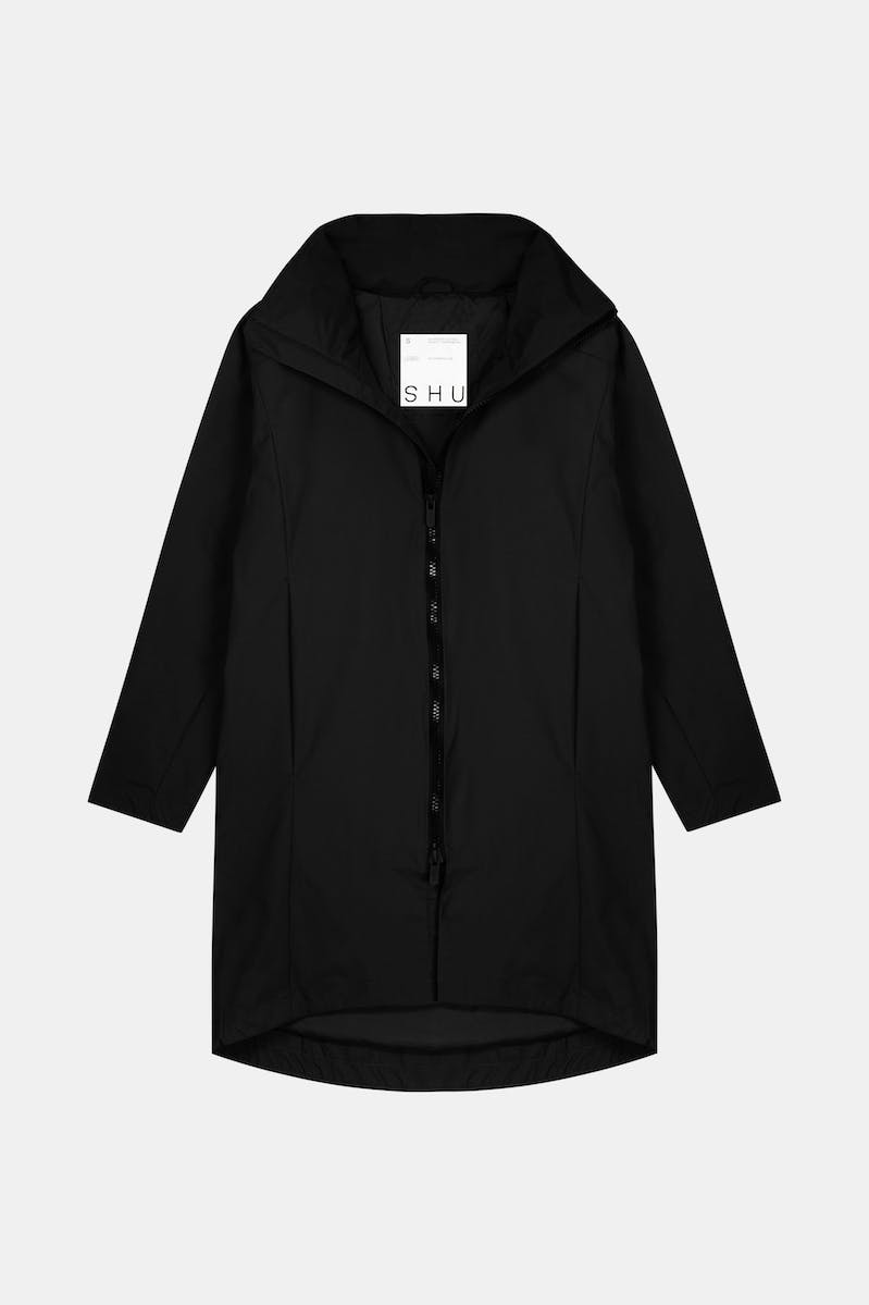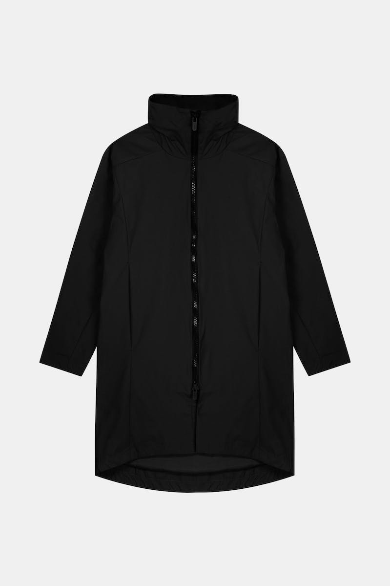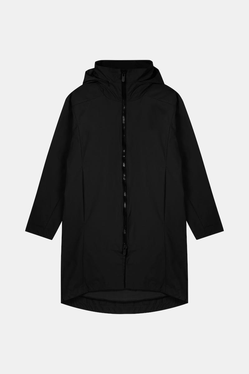 Дождевик прямого силуэта из непромокаемой ткани с высоким воротом и скрытым капюшоном. С помощью кулиски на капюшоне можно регулировать плотность его посадки, что обеспечивает дополнительную защиту от ветра и осадков. Модель на молнии дополнена двумя боковыми карманами. Еще один карман расположен внутри плаща.