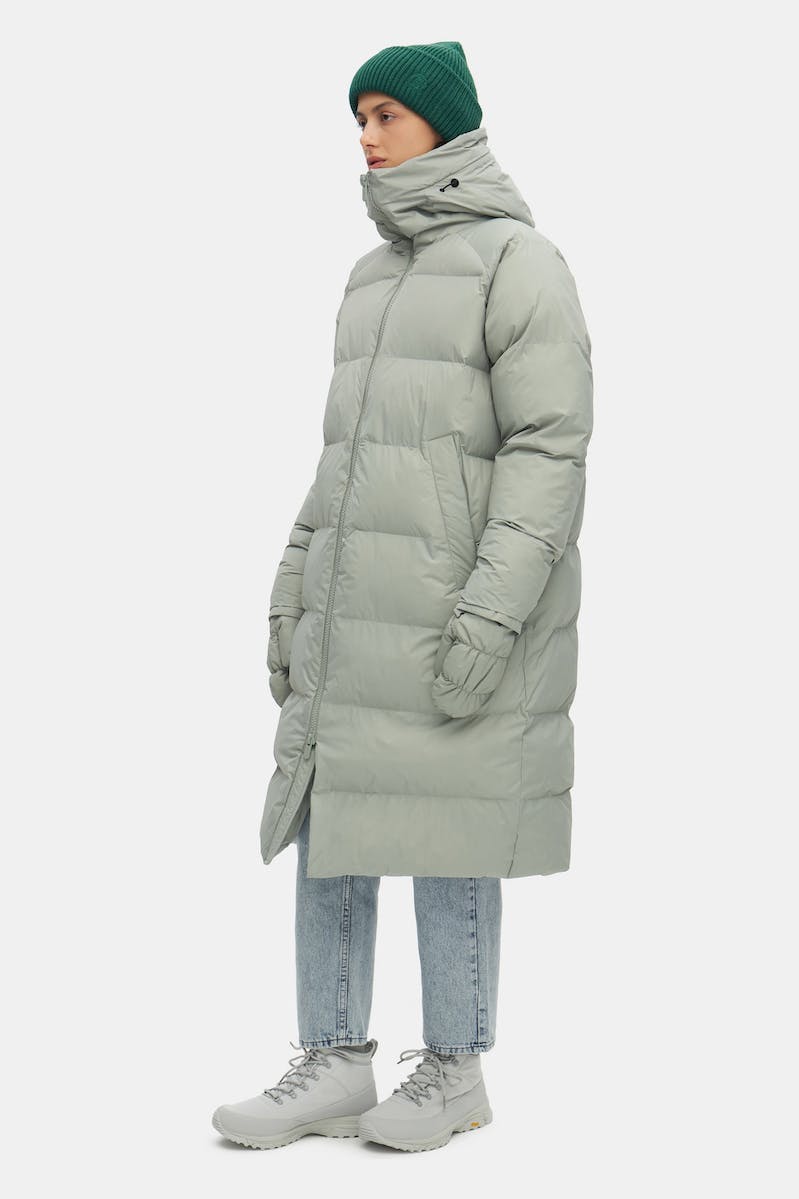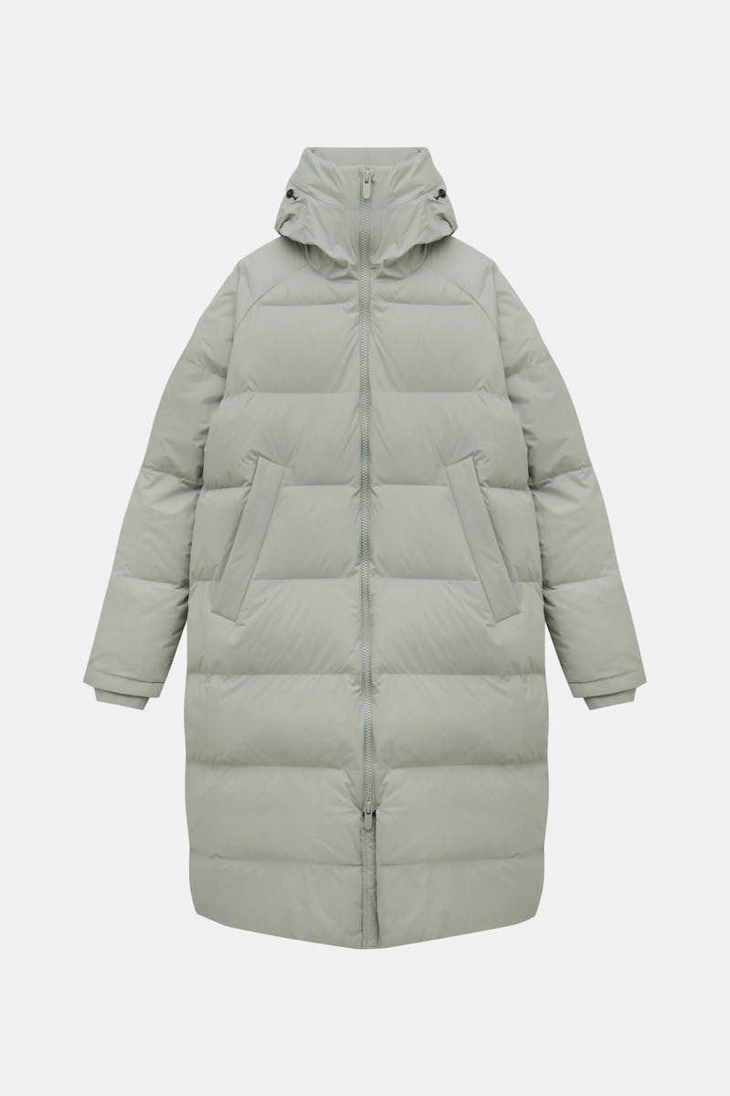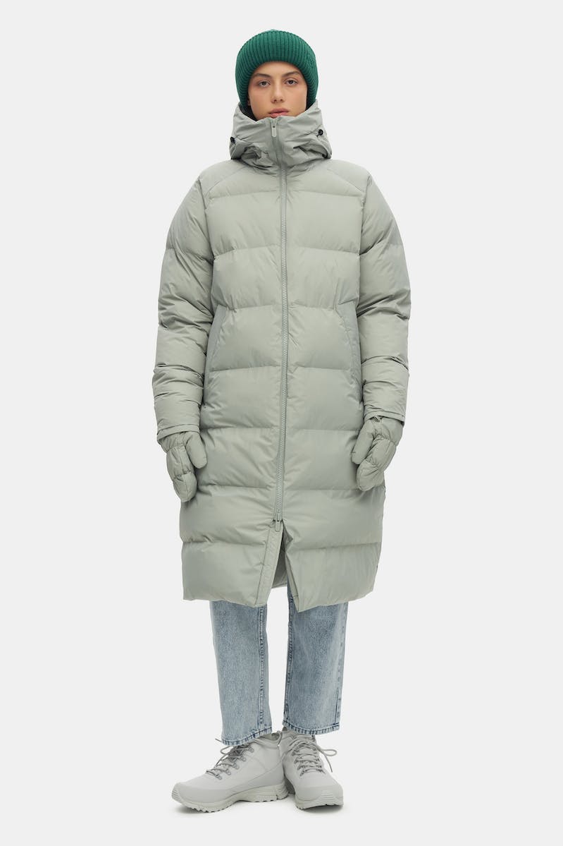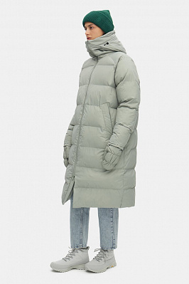 Удлиненный пуховик из непромокаемой ткани с утеплителем Dupont ™ Sorona®. Классическая модель прямого силуэта с капюшоном на кулисках дополнена трикотажными манжетами. Боковые карманы на молнии имеют мягкий флисовый подклад для дополнительного комфорта. Внутренний карман для важных мелочей.