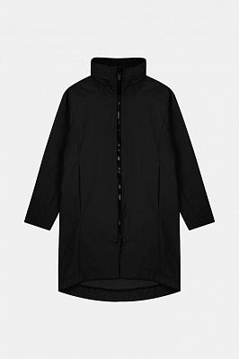 Дождевик прямого силуэта из непромокаемой ткани с высоким воротом и скрытым капюшоном. С помощью кулиски на капюшоне можно регулировать плотность его посадки, что обеспечивает дополнительную защиту от ветра и осадков. Модель на молнии дополнена двумя боковыми карманами. Еще один карман расположен внутри плаща.