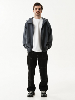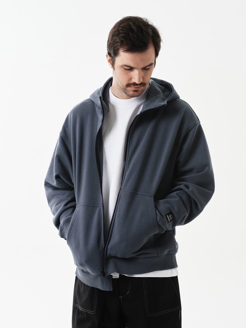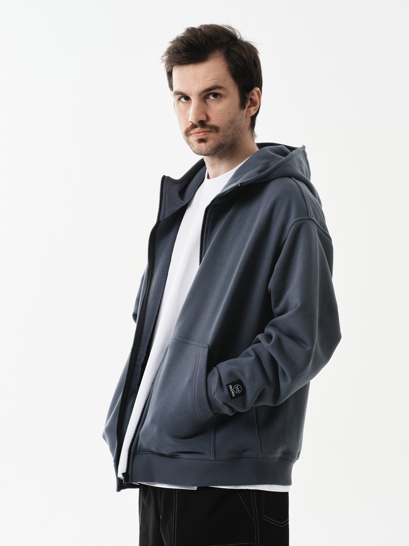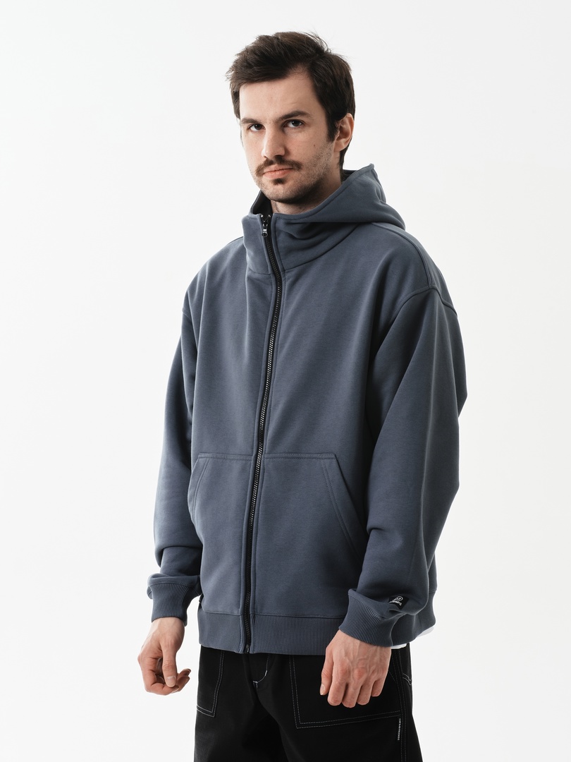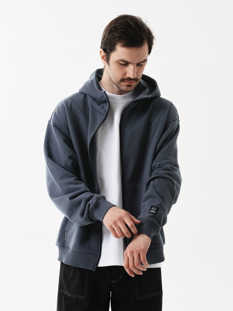 Оверсайз худи на замке из футера без начеса. Два вместительных удобных кармана и металлическая молния во всю длинну.