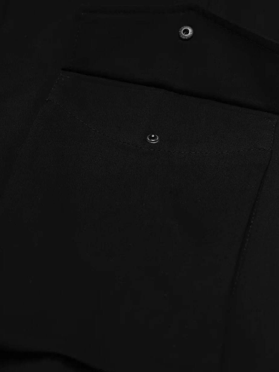 Два карго кармана с клапанами треугольной формы на кнопках, на одном из которых фирменная этикетка с логотипом