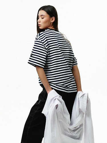 Футболка THE BAD FRIENDS UNIBasic left sleeve logo 250гр Stripes белый-т.синий