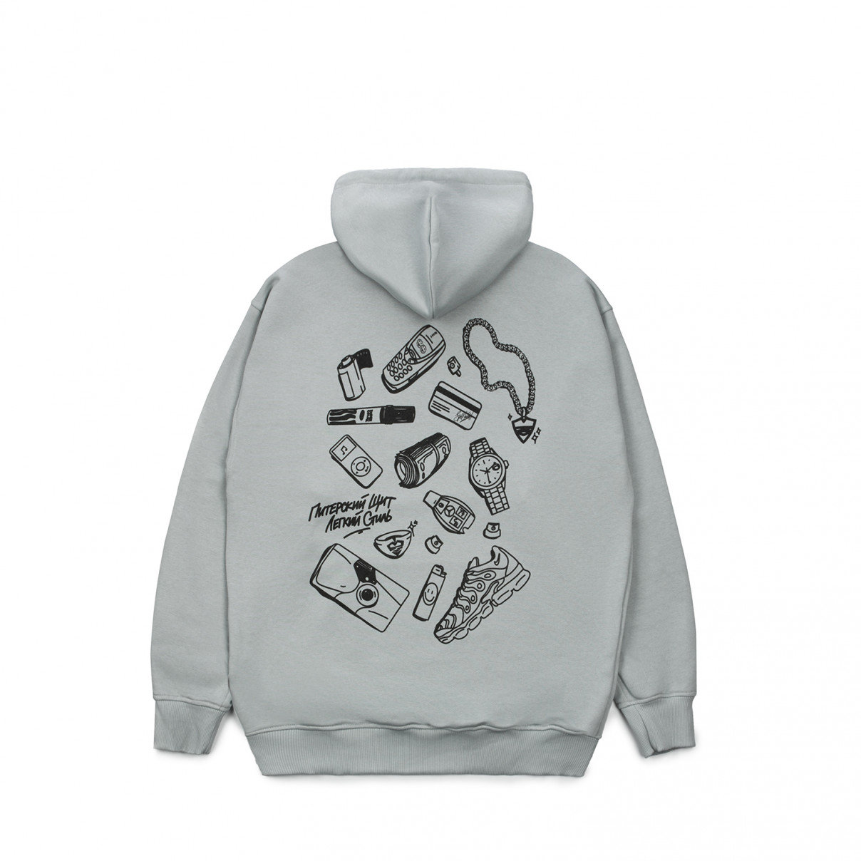 Худи оверсайз силуэта выполнено из натурального футера без начеса, окрашенного в пастельный бледно-васильковый цвет. На грудь нанесен компактный принт, на спину крупная иллюстрация - работы художника работающего под псевдонимом EASYSTYLE. На рукаве расположена силиконовая нашивка коллаборации.