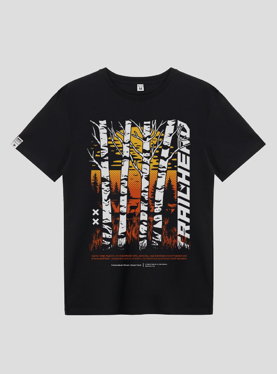 Чёрная футболка Trailhead Wear Indastree с эффектным графическим принтом — идеальный выбор для ценителей уличной моды с философским подтекстом. Центральный элемент дизайна — стилизованный берёзовый лес на фоне закатного неба в тёплых оранжево-жёлтых тонах.