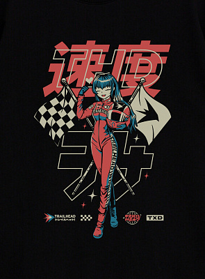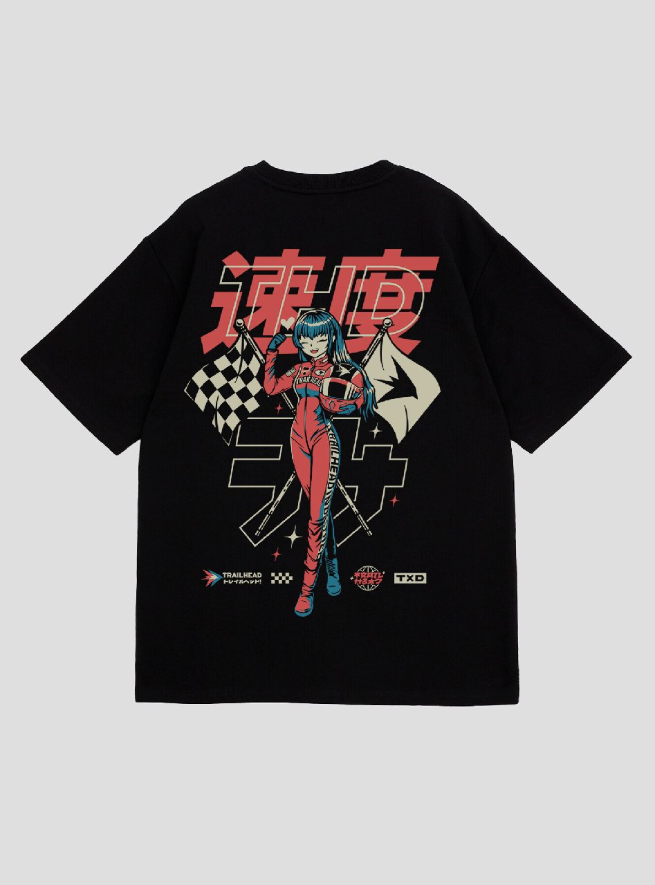 Чёрная оверсайз-футболка с ярким аниме-принтом — стильный акцент для вашего гардероба. На изделии изображён харизматичный персонаж в гоночном костюме, держащий клетчатый флаг — символ скорости и драйва.