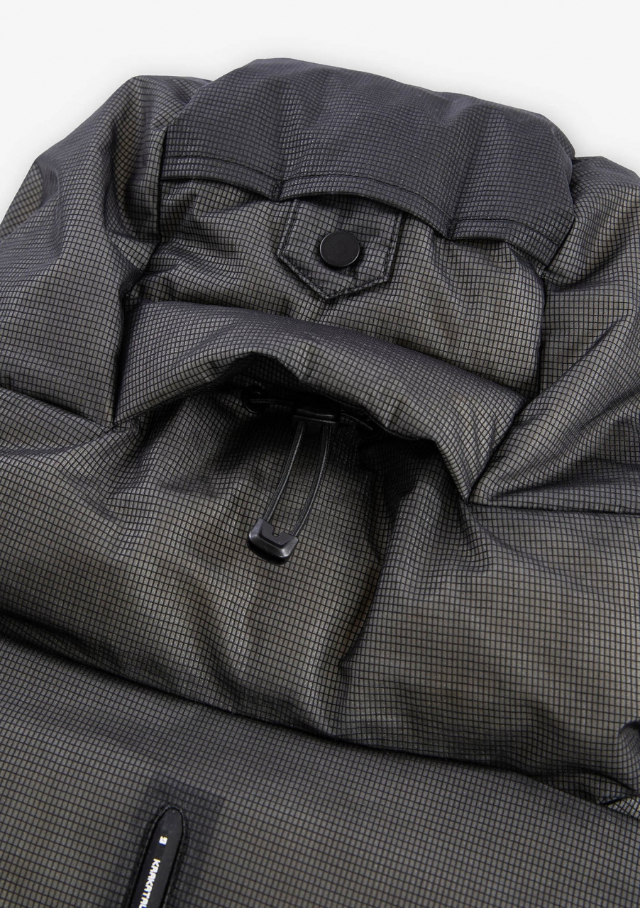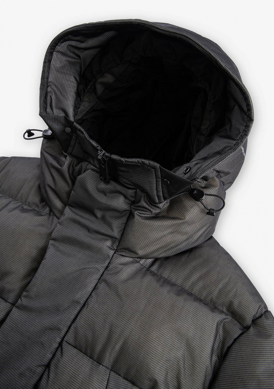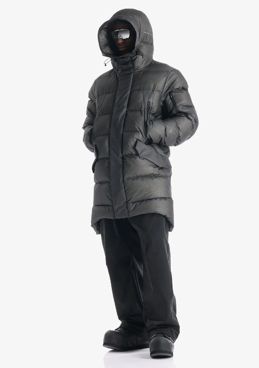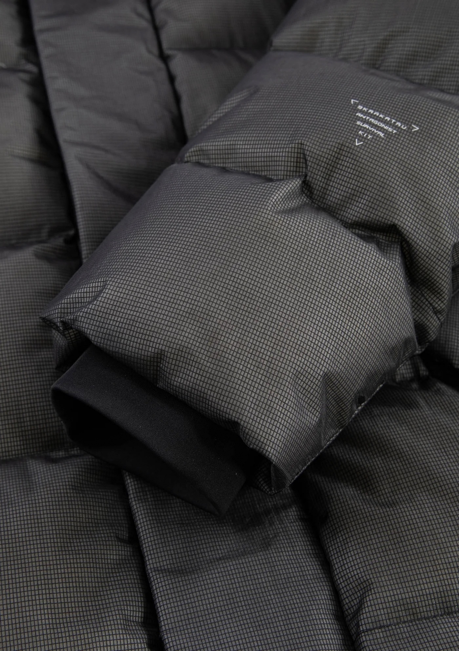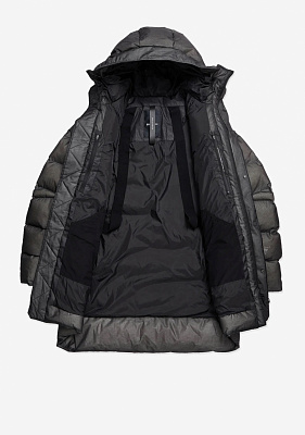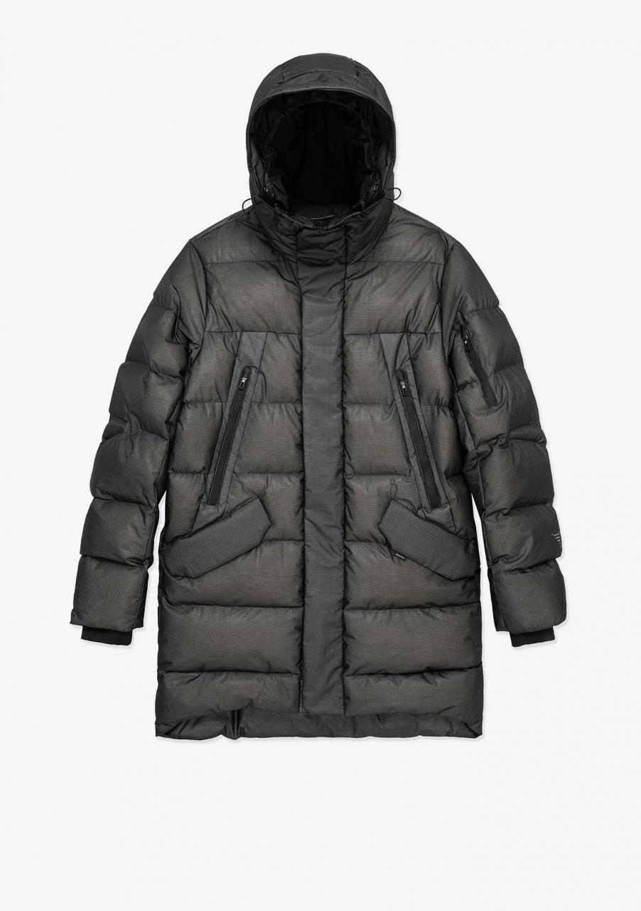 Удлинённый пуховик STROFO из плотного нейлонового рип-стопа с металлизированной мембраной.