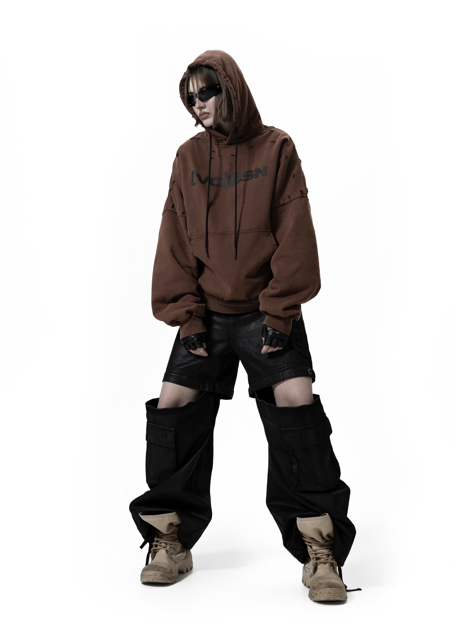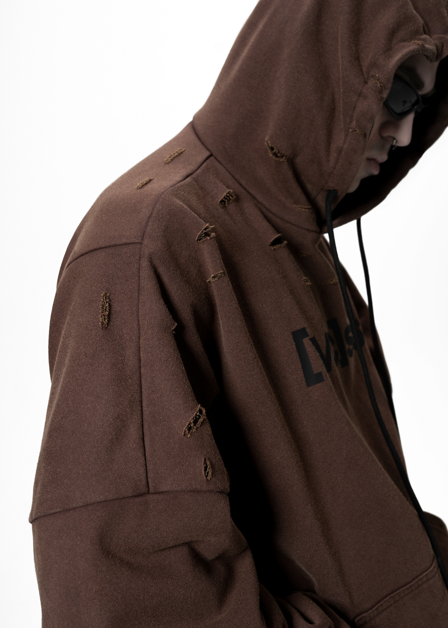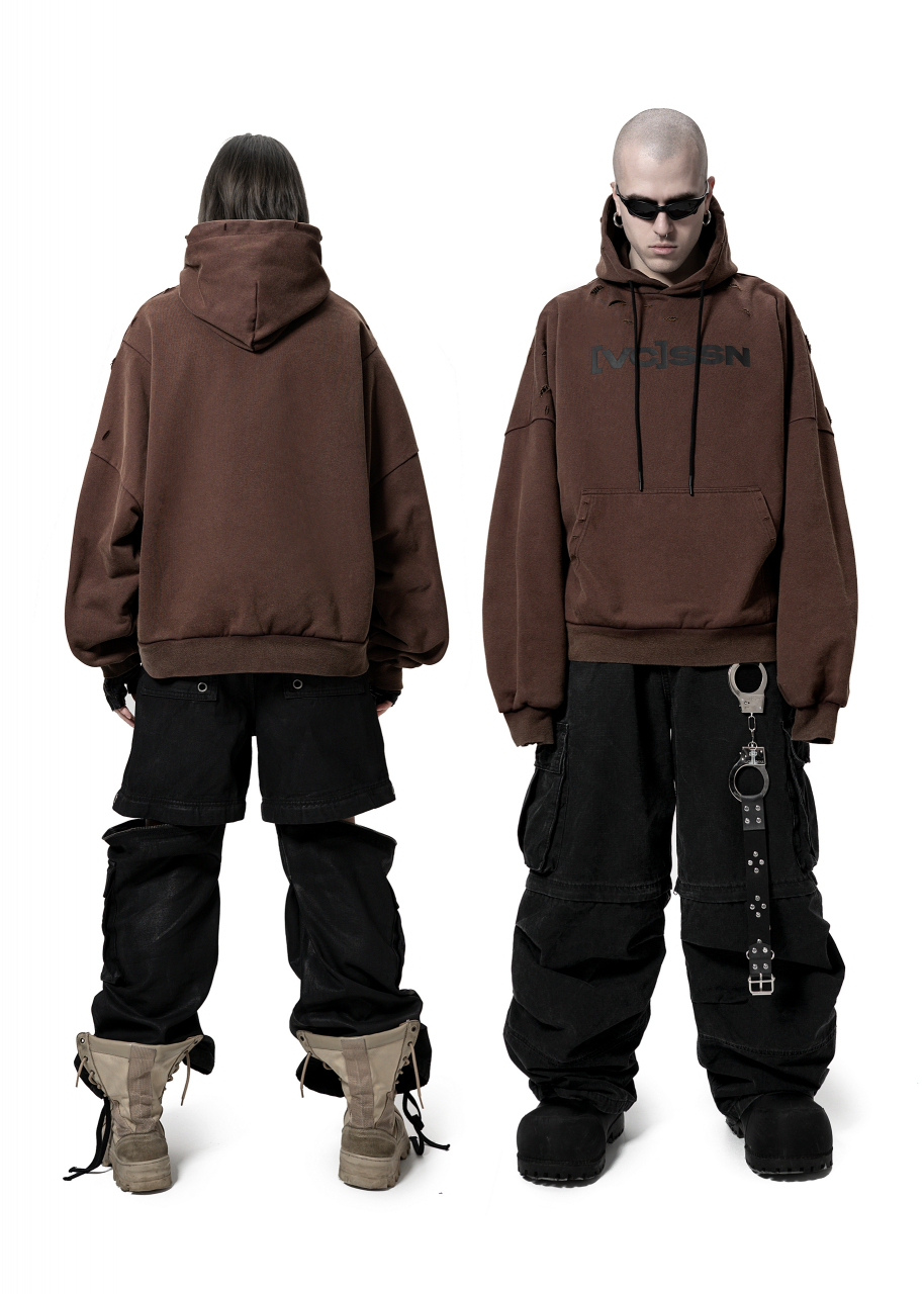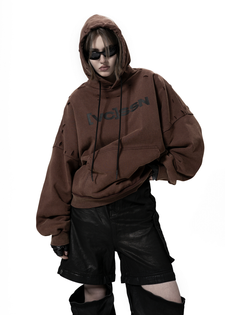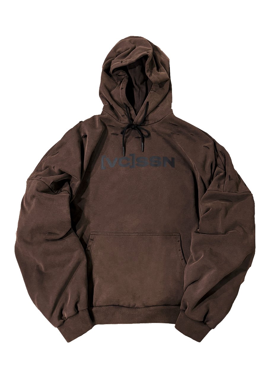 Ультра объёмный тяжелый оверсайз-силуэт с массивным капюшоном, заниженным плечом. Вес худи ~ 2кг. Худи обработано дистресс техникой по верхнему слою. Минимум декоративных деталей — максимум веса и фактуры. На груди — прочный брендинг [VC]SSN, напоминающий маркировку складов с опасным содержимым. На базальтовом - рефлектив, на сепии - матовый черный.