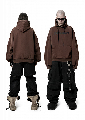 Ультра объёмный тяжелый оверсайз-силуэт с массивным капюшоном, заниженным плечом. Вес худи ~ 2кг. Худи обработано дистресс техникой по верхнему слою. Минимум декоративных деталей — максимум веса и фактуры. На груди — прочный брендинг [VC]SSN, напоминающий маркировку складов с опасным содержимым. На базальтовом - рефлектив, на сепии - матовый черный. 16790