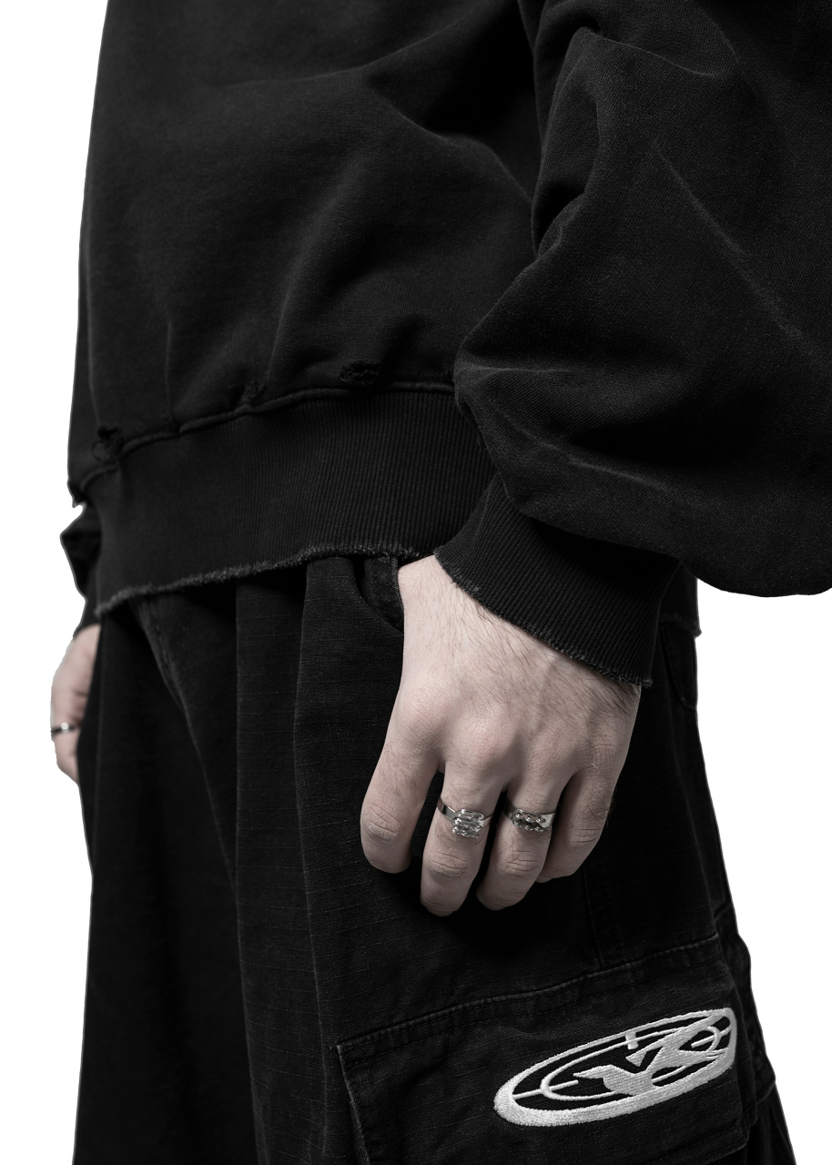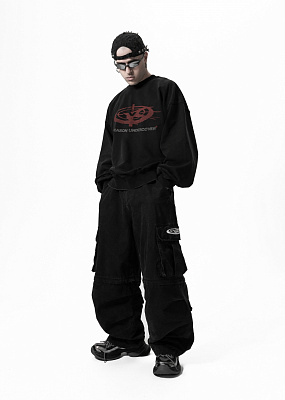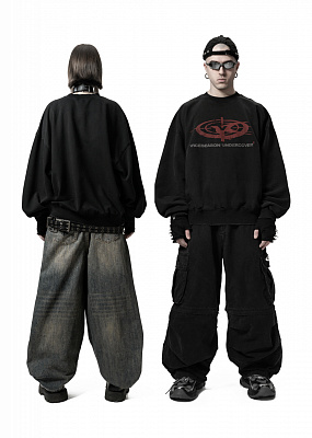 Укороченный объемный силуэт с заниженным плечом и широкими рукавами. Внизу форма собирается и фиксируется на манжетах. Это универсальный комфортный фасон, который имеет все шансы стать вашей самой «носибельной» вещью в гардеробе. Швы обработаны дистресс техникой. На груди - потрескавшийся принт лого в багрово-грязном оттенке в орбитальной геометрии. Дополнен темно-серой надписью-брендингом. 9790