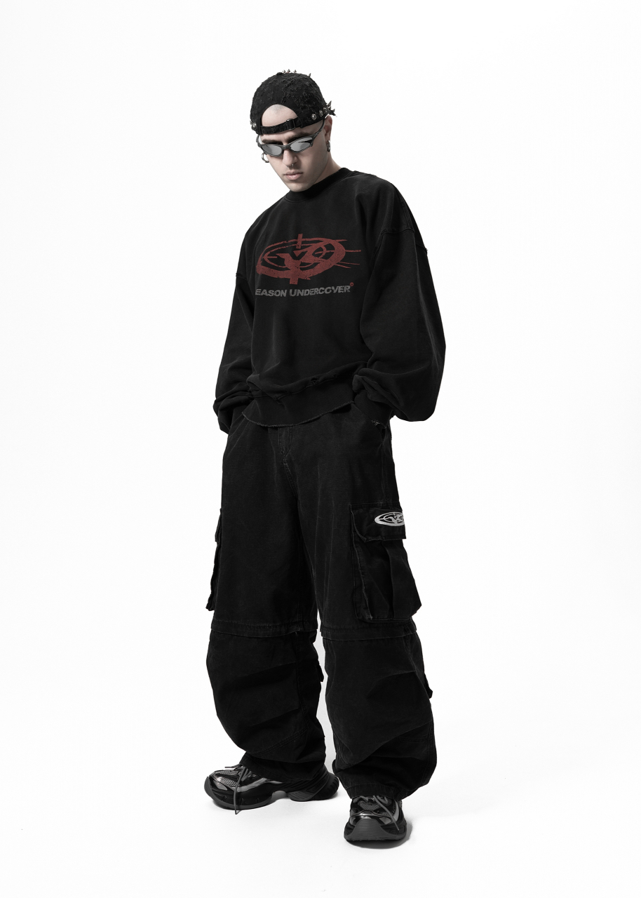 Укороченный объемный силуэт с заниженным плечом и широкими рукавами. Внизу форма собирается и фиксируется на манжетах. Это универсальный комфортный фасон, который имеет все шансы стать вашей самой «носибельной» вещью в гардеробе. Швы обработаны дистресс техникой. На груди - потрескавшийся принт лого в багрово-грязном оттенке в орбитальной геометрии. Дополнен темно-серой надписью-брендингом.