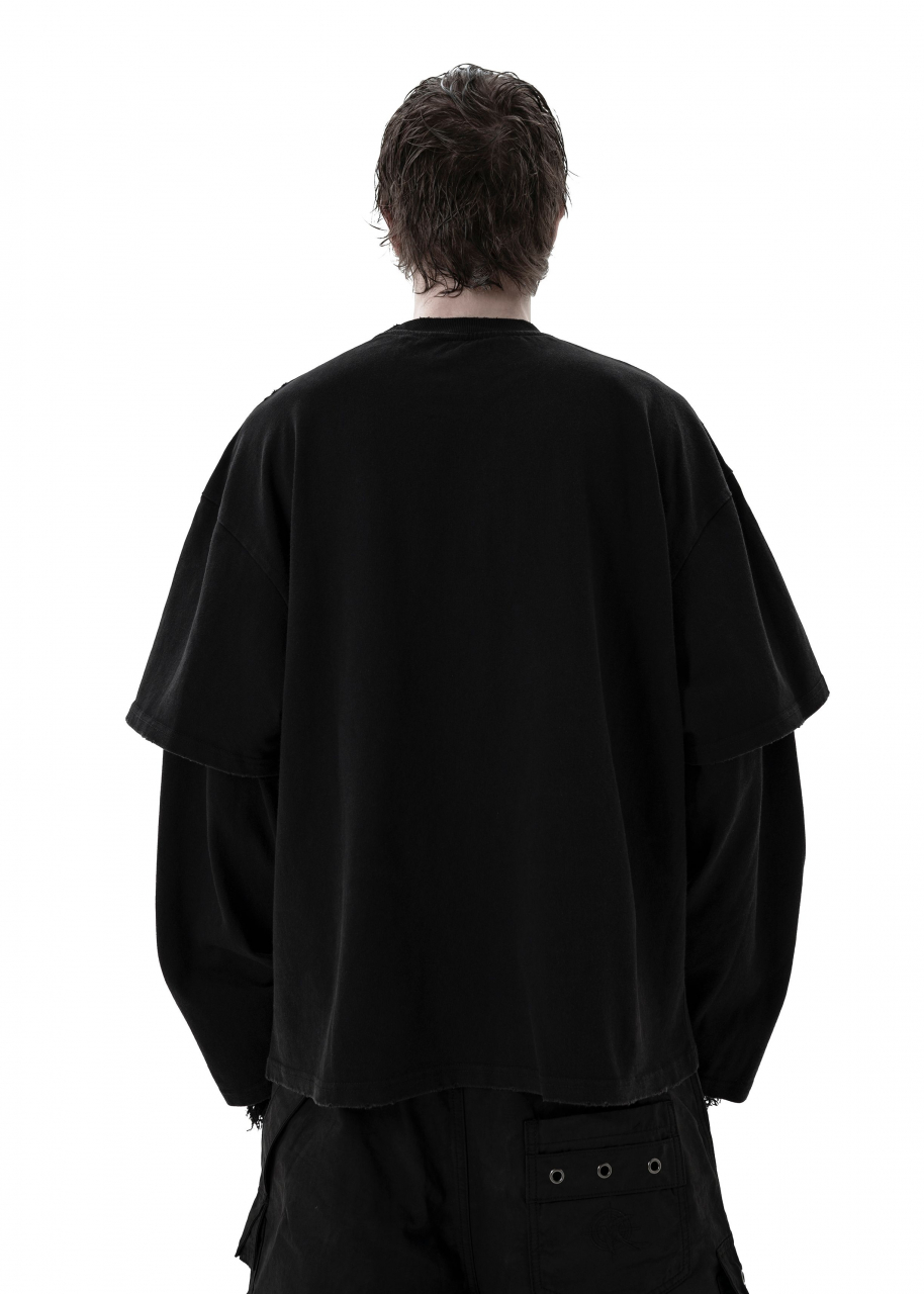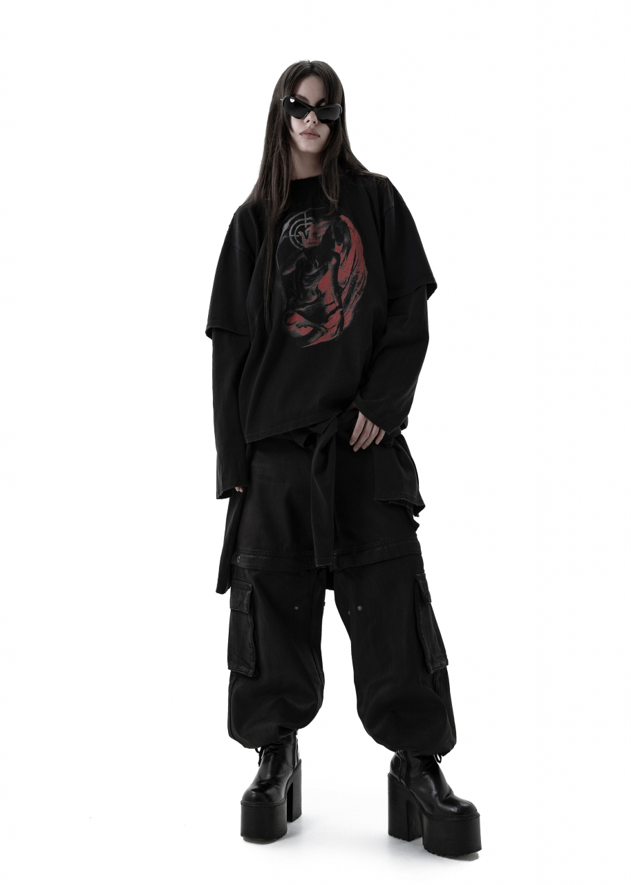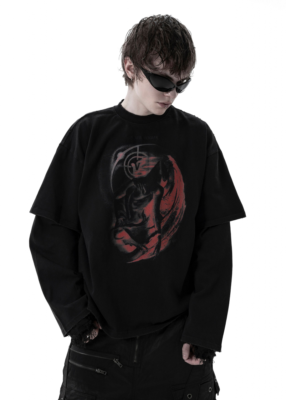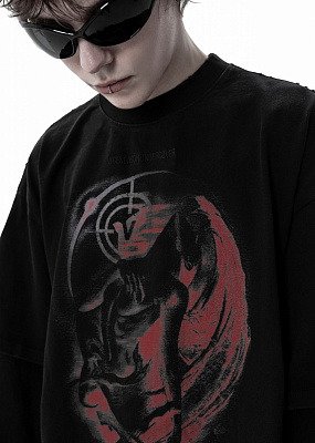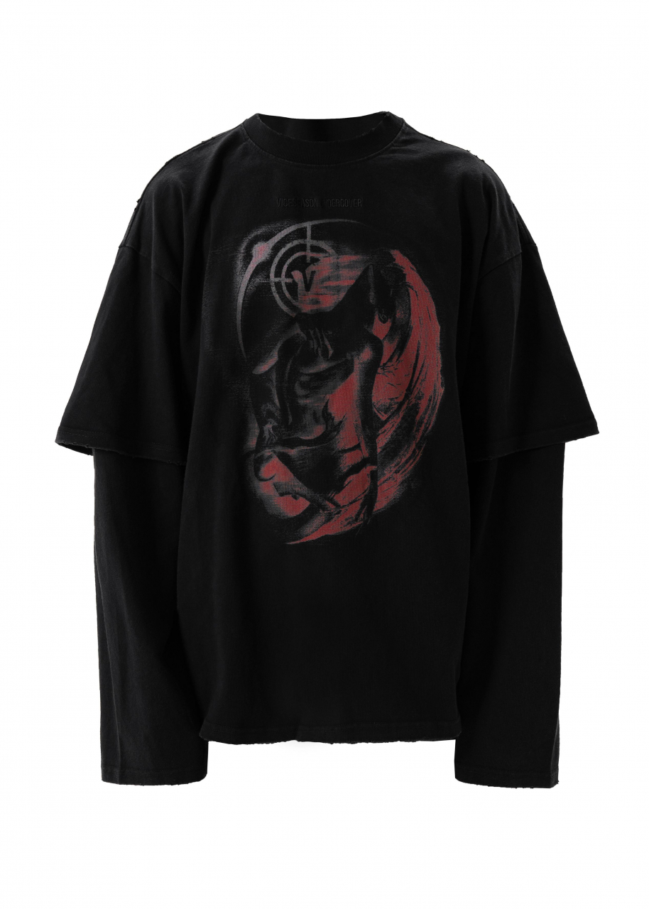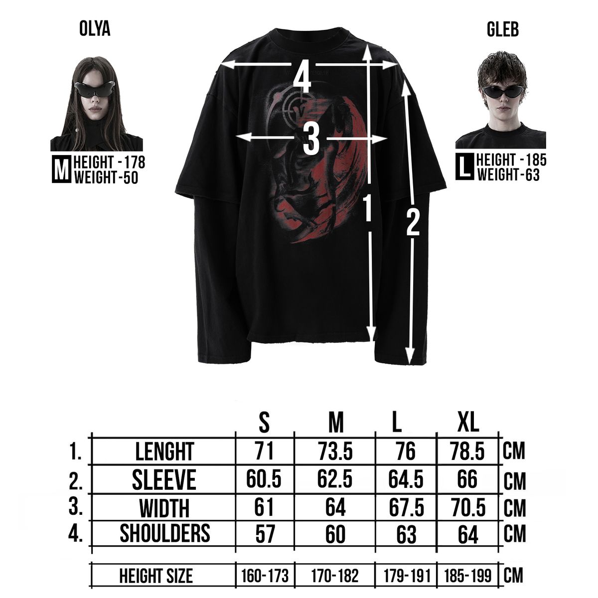 Свободный прямой оверсайз крой. Объемные двойные рукава. Швы и края изделия обработаны в технике дистресс для создания небрежного вида. Принт выполнен долговечной цифровой печатью в тусклых темных оттенках в эстетике линейки. Вышивка брендинга над принтом.Все размеры изначально сделаны в оверсайз, поэтому мы рекомендуем брать свой размер.