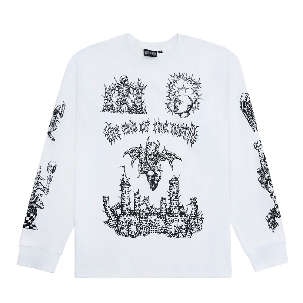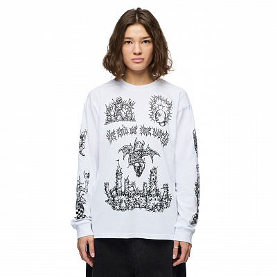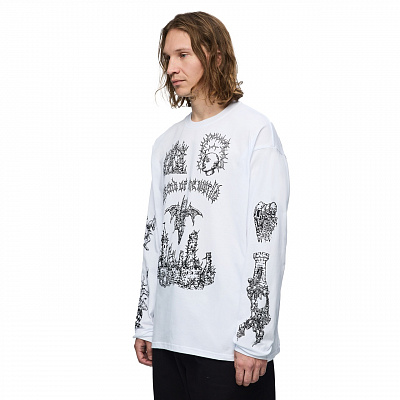 Коллаборация с художником -татуировщиком @kaplya_tattooerЛонгслив свободного кроя с круглым вырезом, приспущенная линия плеч, втачной рукав, принт шелкография.