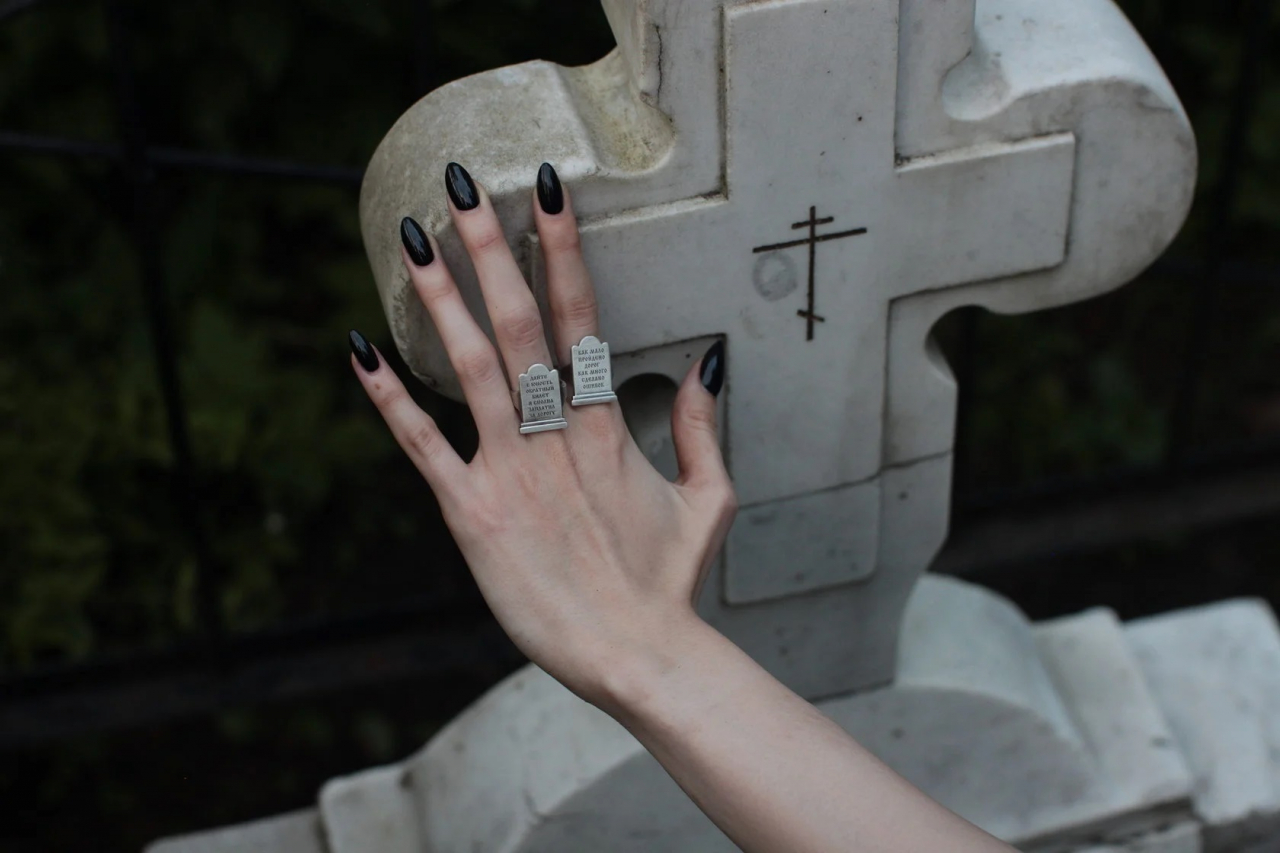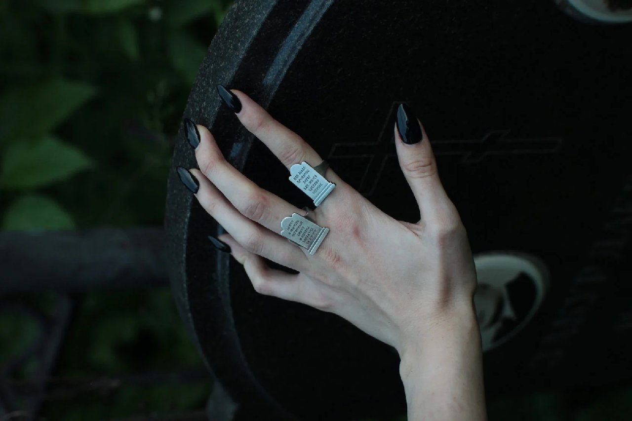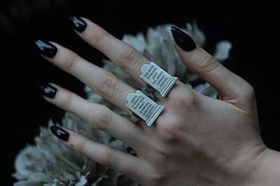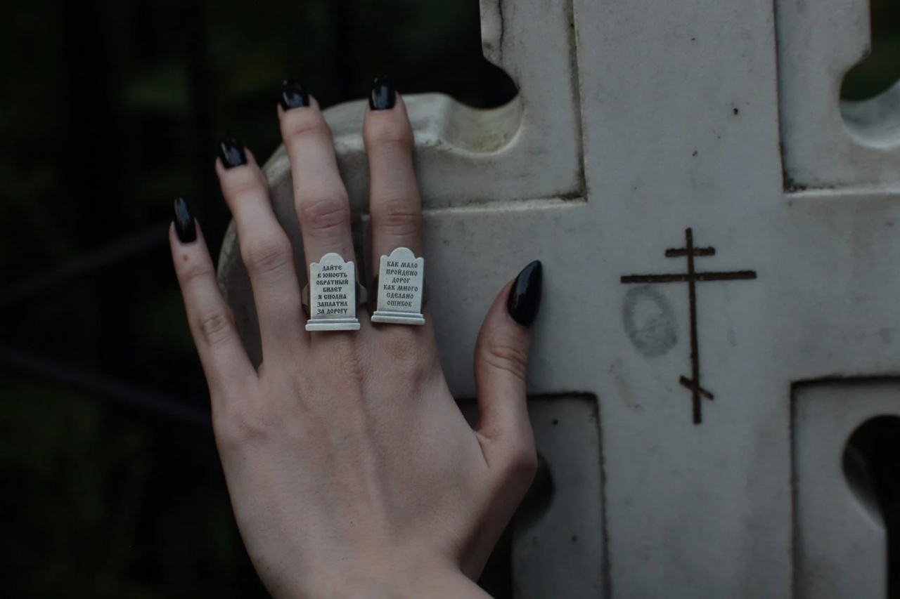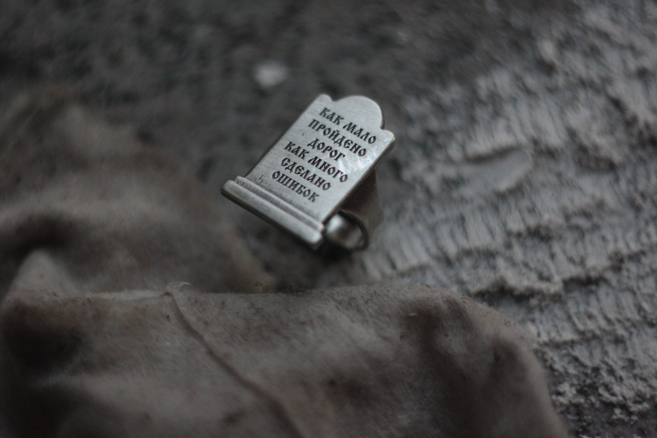 Кольцо в форме могильного камня с текстом: "как мало пройдено дорог, как много сделано ошибок"