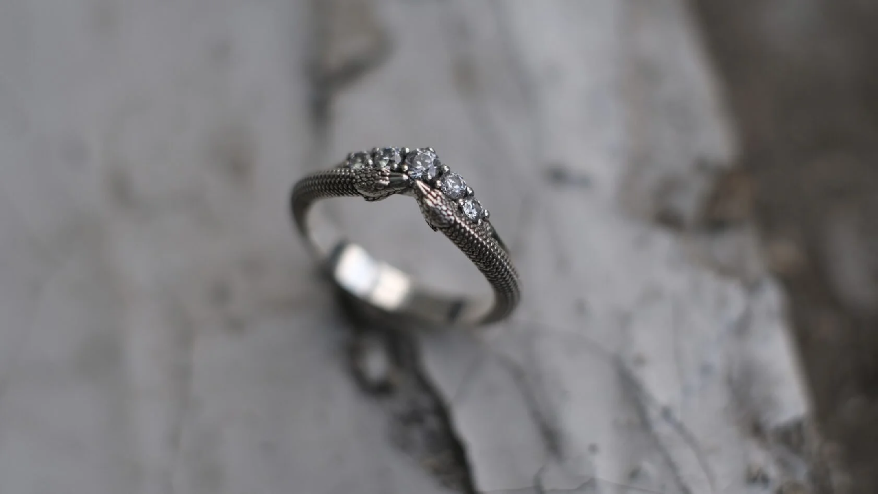 Помолвочное кольцо выполнено в форме двух змей. Сделано с фианитами сваровски, чернением в углублениях и глянцевым финишем.