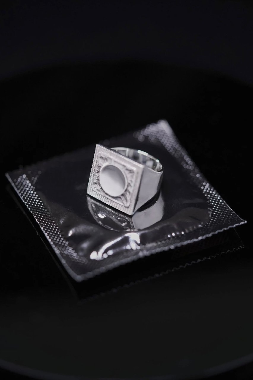 Кольцо в форме упакованного презерватива, выполнено в рамках благотворительной коллаборации с фондом "Гуманитарное действие".