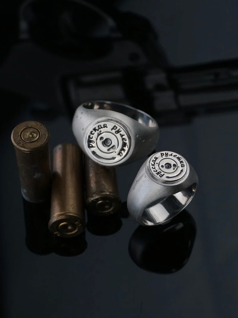 Кольцо-печатка, выпущенное в рамках коллаборации с брендом СПУТНИК1985. Площадка выполнена в форме гильзы пули с гравировкой текста "Русская рулетка" 5200
