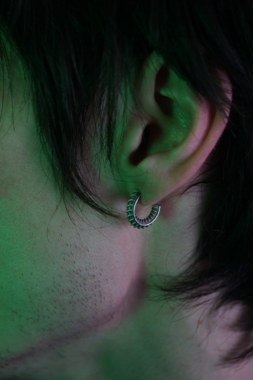 Сережка-кольцо в матовом финише с чернением в рельефе в форме арматуры. Продаются по одной штуке. Выпущены в рамках совместной коллекции с xo0or.