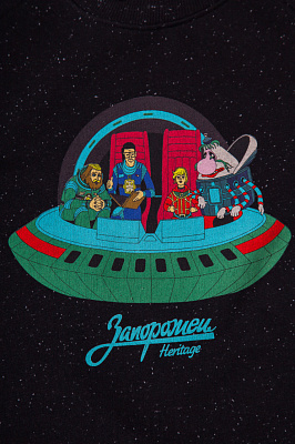 Толстовка российского бренда Запорожец, вышедшая в коллаборации с компанией СоюзМультфильм и вдохновлённая знаменитым мультипликационным фильмом «Тайна третьей планеты». Традиционный силуэт, прямой крой и круглый ворот. Рукав-реглан и эластичные манжеты для обеспечения оптимальной посадки. Толстовка представлена в однотонной расцветке с яркими вкраплениями и украшена принтом с главными героями.