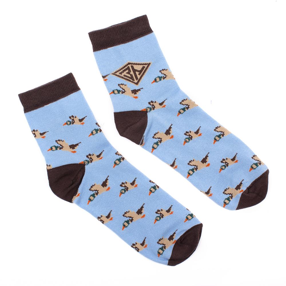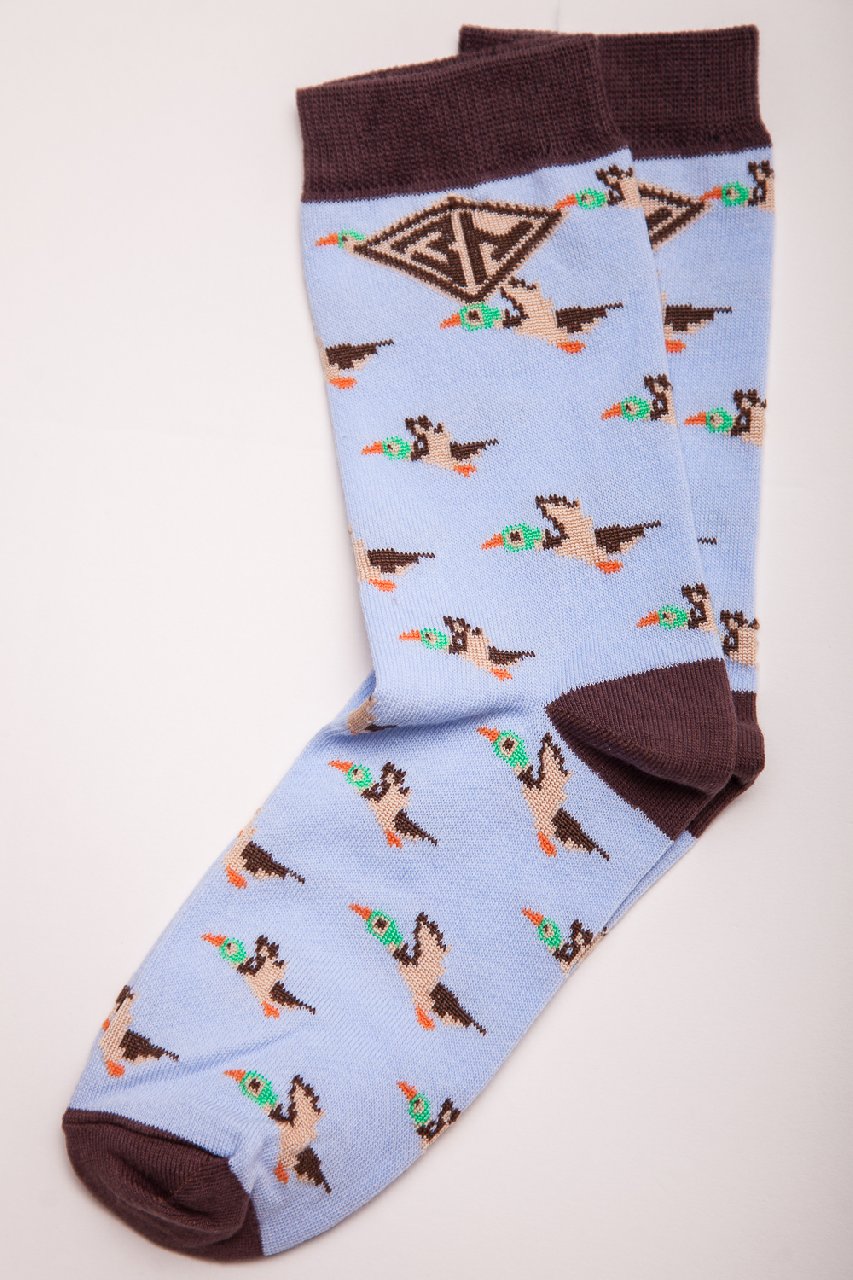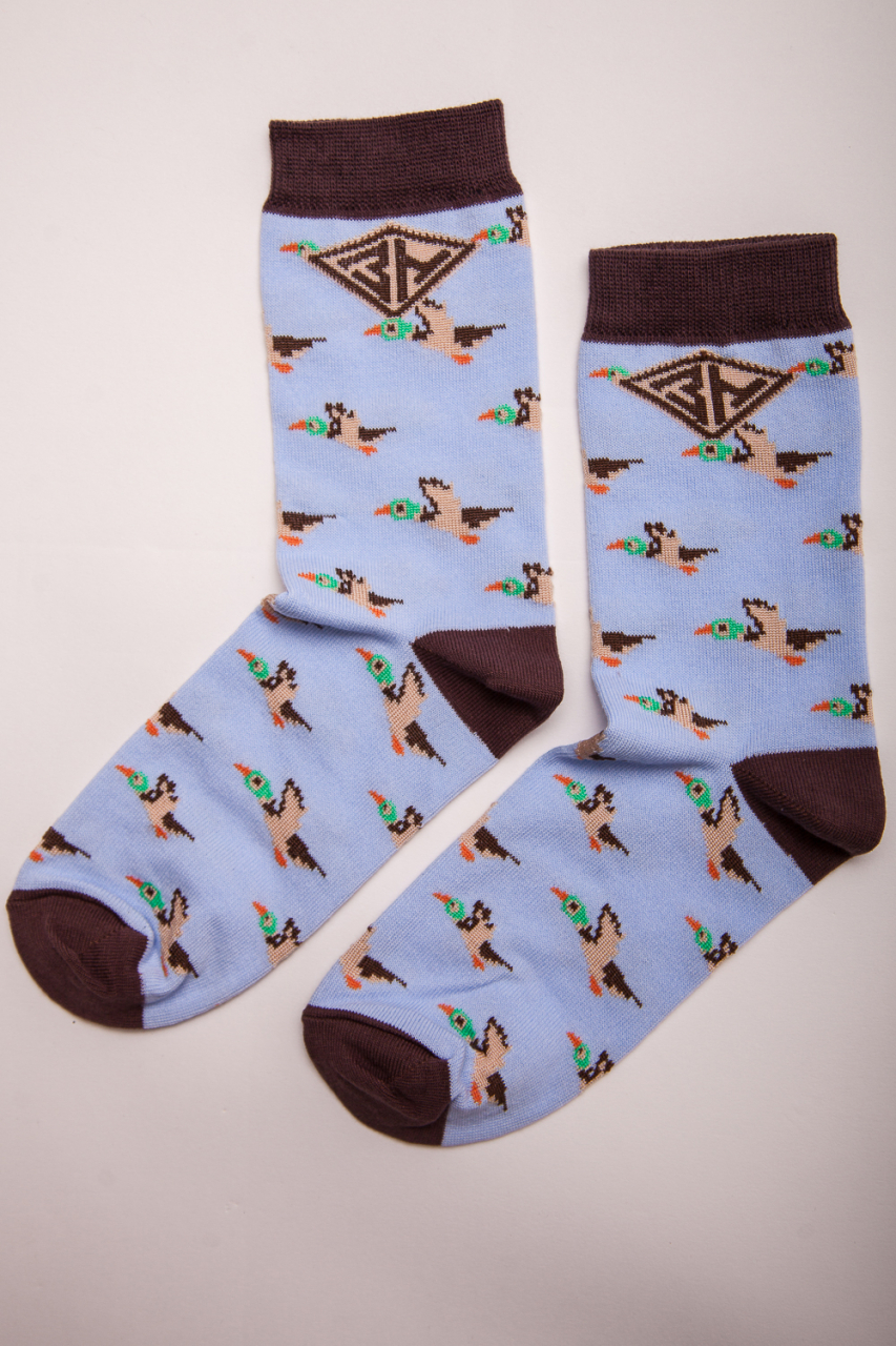 Носки от бренда Запорожец, выполненные из натуральной хлопковой ткани. Традиционная форма, средняя длина, укрепленный носок с пяткой и эластичная резинка в верхней части, обеспечивающая оптимальную фиксацию. Носки представлены в оригинальной расцветке, украшенной изображениями уток на всей поверхности.