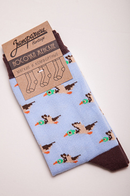 Носки от бренда Запорожец, выполненные из натуральной хлопковой ткани. Традиционная форма, средняя длина, укрепленный носок с пяткой и эластичная резинка в верхней части, обеспечивающая оптимальную фиксацию. Носки представлены в оригинальной расцветке, украшенной изображениями уток на всей поверхности.- Натуральная хлопковая ткань