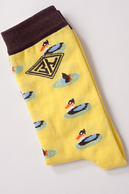 Носки Запорожец, выполненные из натуральной хлопковой ткани. Традиционная форма, средняя длина, укрепленный носок с пяткой и эластичная резинка в верхней части, обеспечивающая оптимальную фиксацию. Носки представлены в оригинальной расцветке, украшенной изображениями уток на всей поверхности.